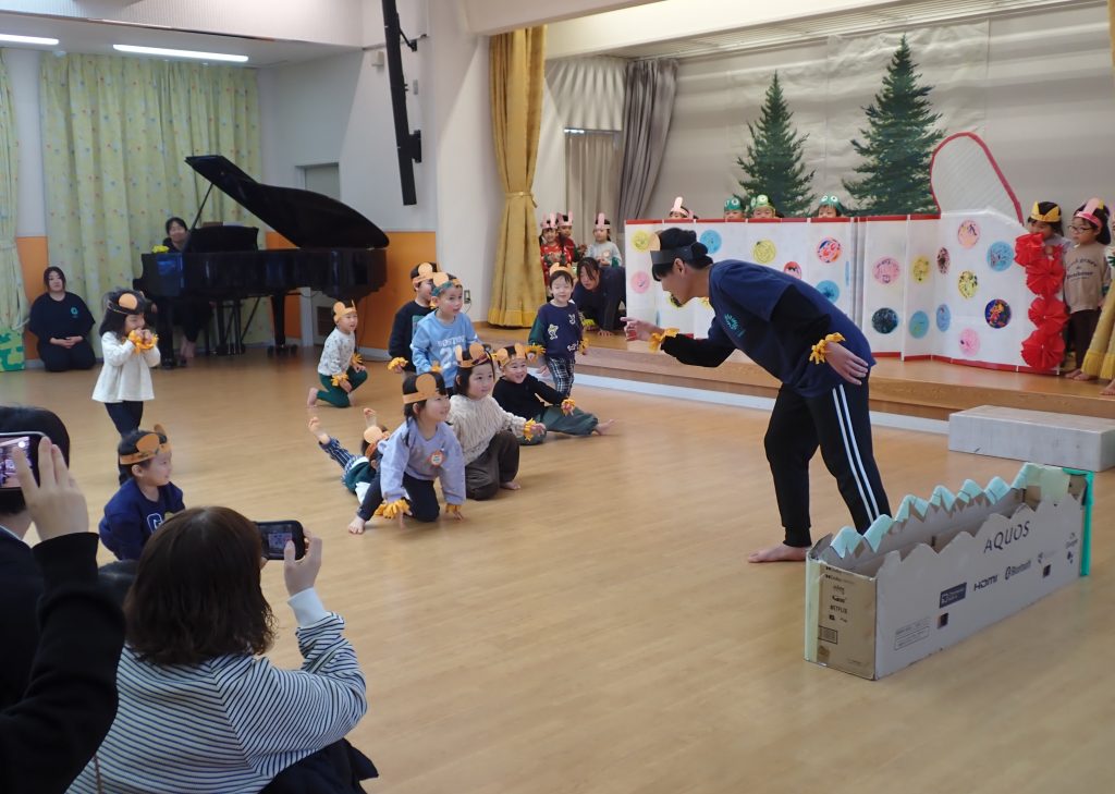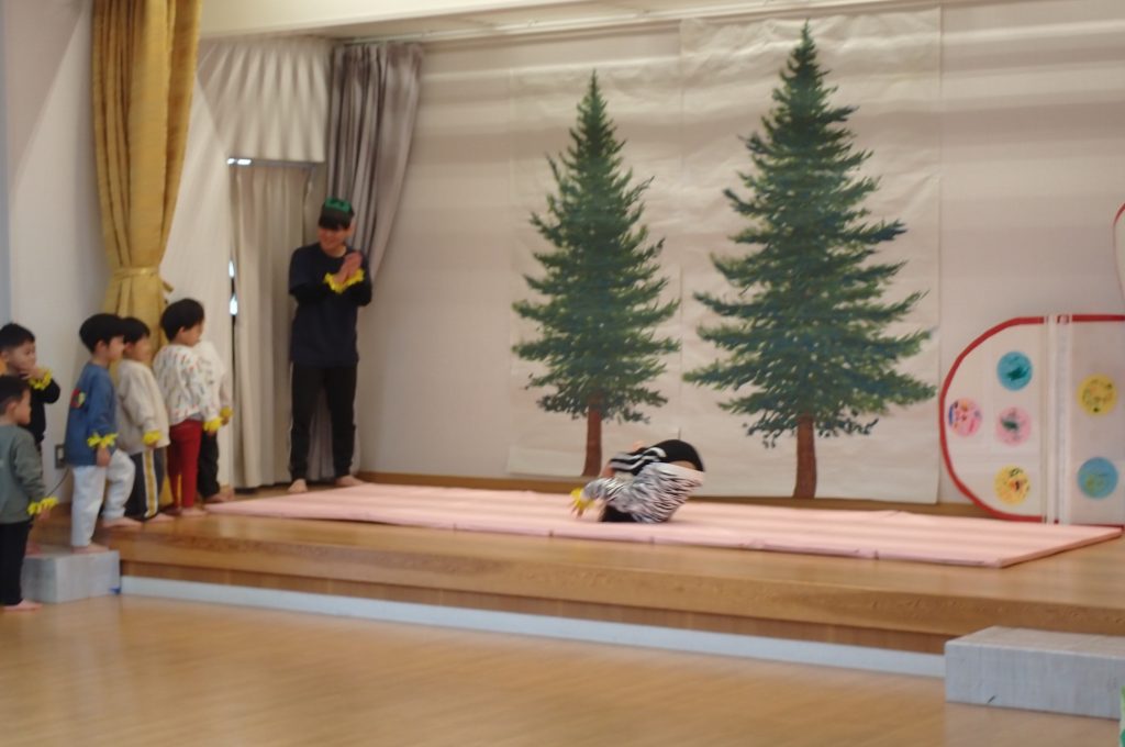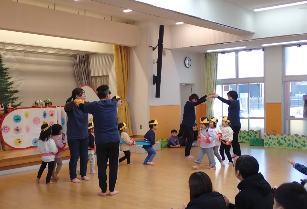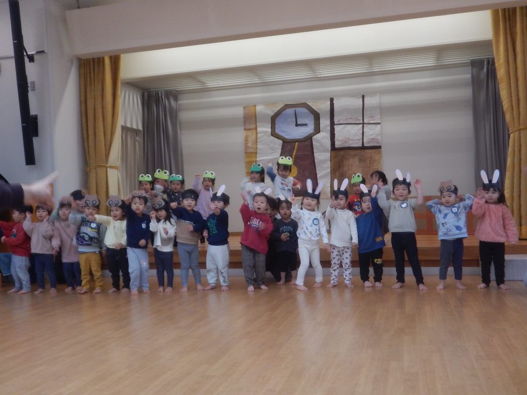 3歳児も普段の生活や遊びの姿を取り入れて「てぶくろ」の劇遊びを4チームに分かれて披露しました。