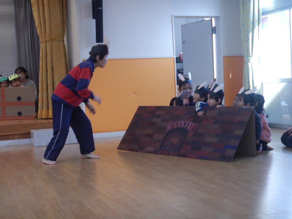 普段の遊びや生活の姿を取り入れ「3匹の動物とおおかみ」の劇遊びをしました。