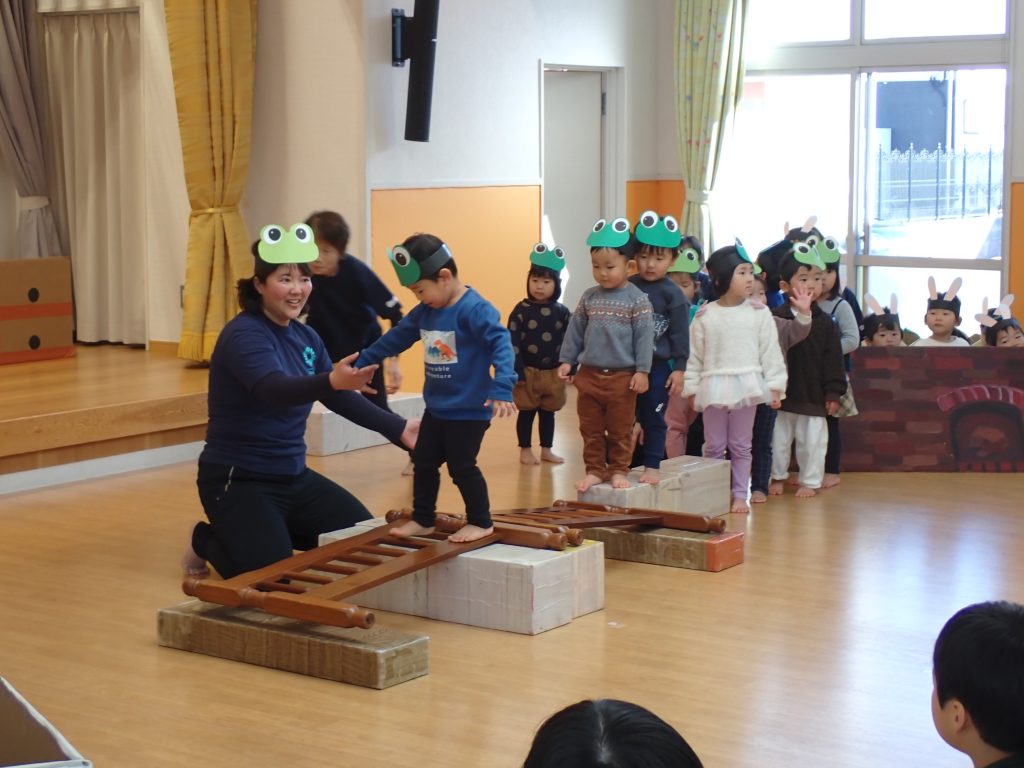 ウッドブロックで「こぎつね」を演奏したり、「かもつ列車」の歌に合わせて輪っかに入り保育士のトンネルをくぐったりして楽しみました。