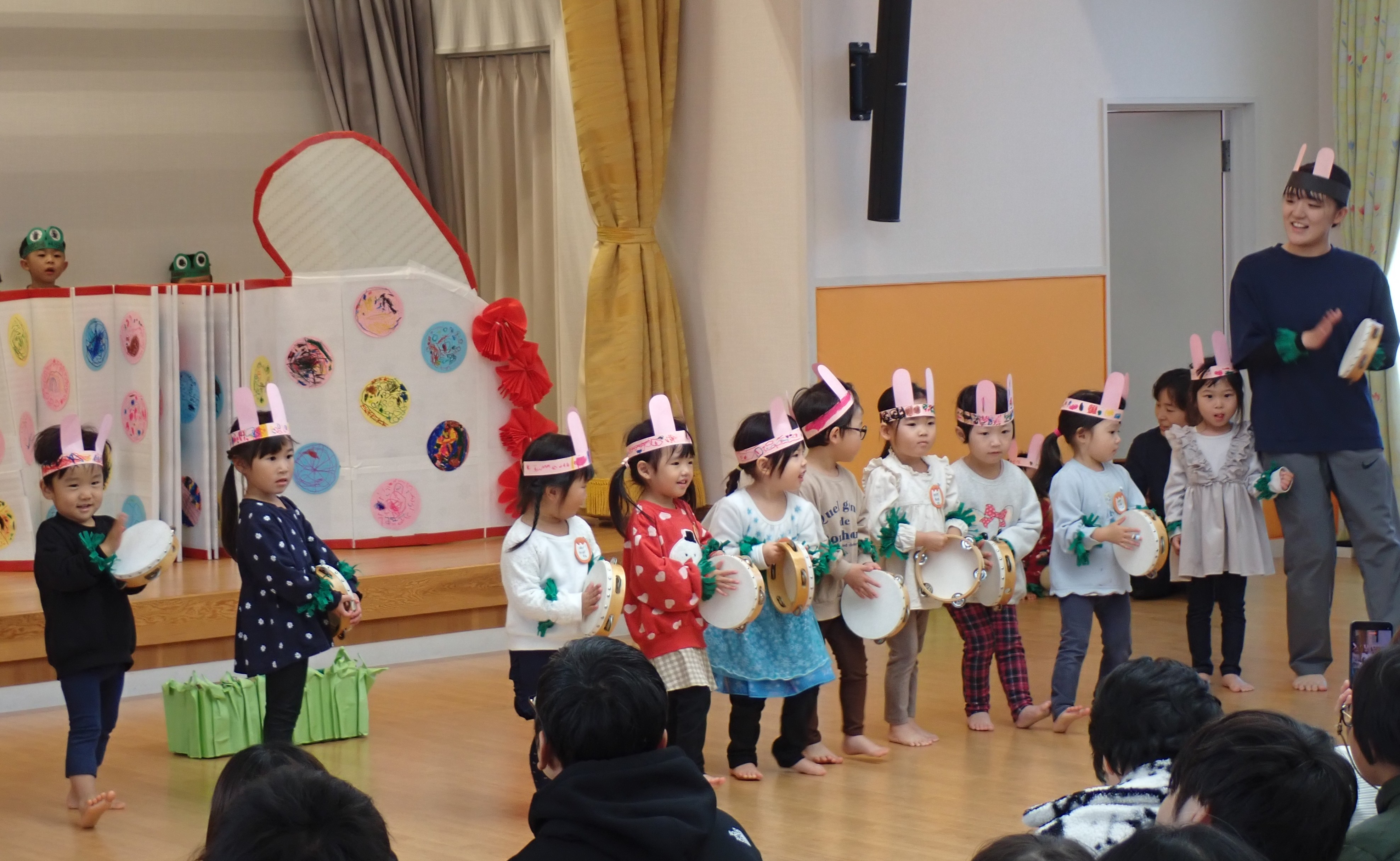 タンバリンを「うさぎのダンス」の歌に合わせて叩いたり、